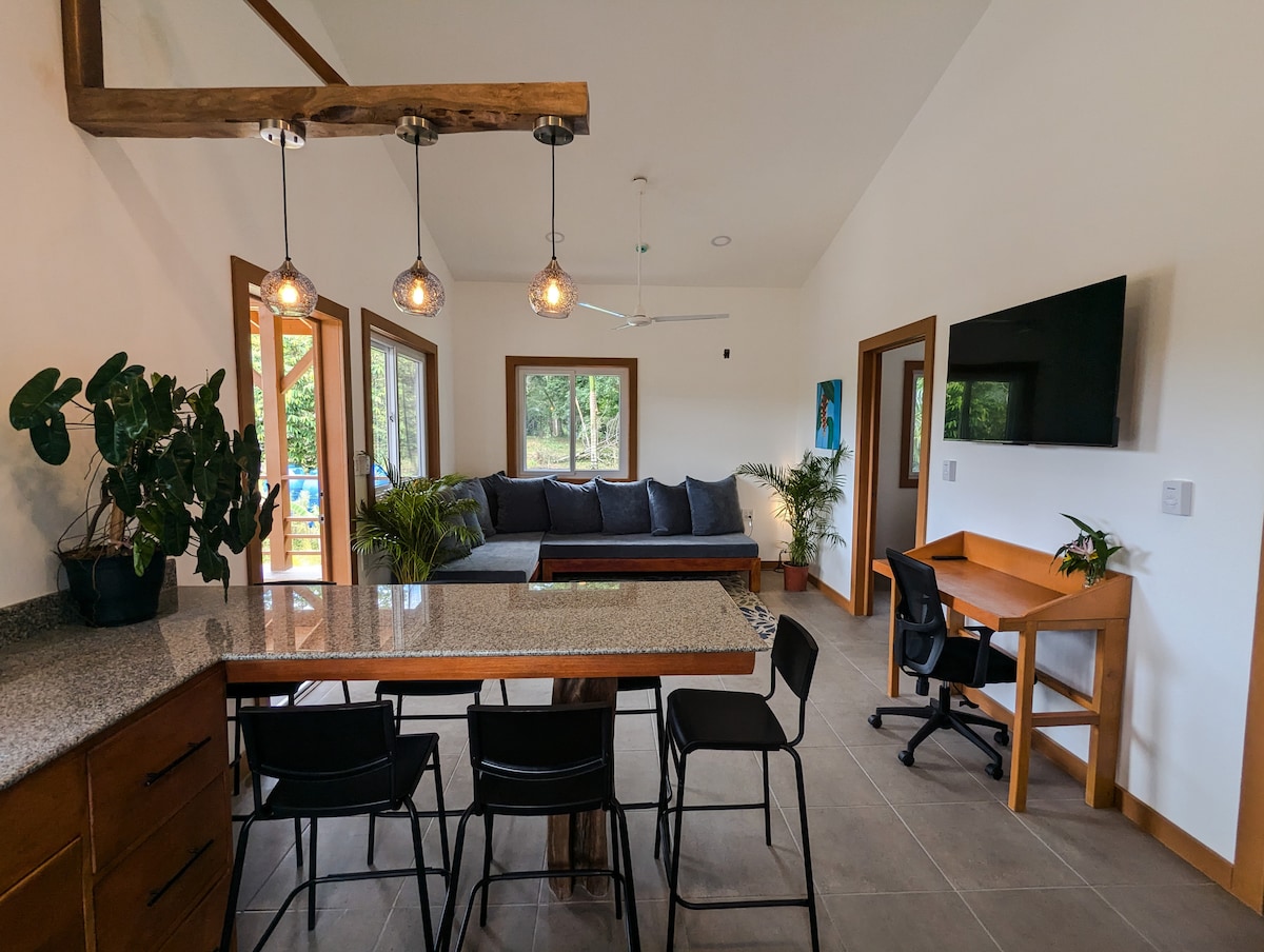 Petit déjeuné inclus ! A 10 min en taxis du centre, venez vous détendre dans la jungle de Bocas del Toro. Idéal pour les couples amoureux de la nature où vous observerez les singes hurleurs, capucins, toucans ou iguanes depuis votre piscine privée ou de votre lit king size. Cette habitation chic et eco-responsable vous offre tout le confort nécessaire pour un séjour inoubliable sur cette île. Salle de bain avec eau chaude, cuisine équipée, piscine privée dans la jungle.