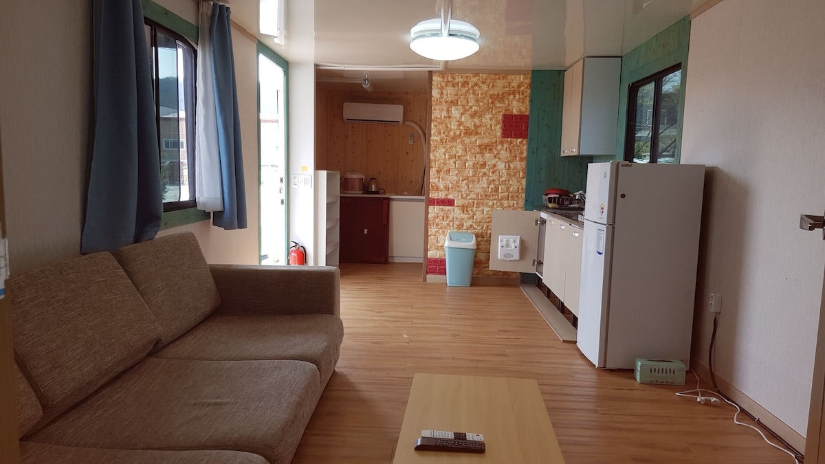 오션뷰, 개별바베큐, 샤워-취사-화장실 가능 퀸사이즈 침대, 쇼파베드, 쇼파, 의자 2, 신발장, 보일러(바닥온돌), 에어컨, TV,WIFI, 빈티지오디오(Marantz 2220B), 냉장고, 커피포트, 인스턴트 커피,전자레인지, 가스레인지, 전기밥솥, 식탁, 싱크대(냄비, 프라이팬, 기본양념 및 식기류..), 헤어 드라이기, 빗, 욕실(샤워실, 변기, 세면대, 타올, 수건, 화장지, 치약, 비누, 폼클린징, 샴푸, 린스, 바디샴푸..) + 바다전망 데크 경북 영덕군 강구면 영덕대게로 577
