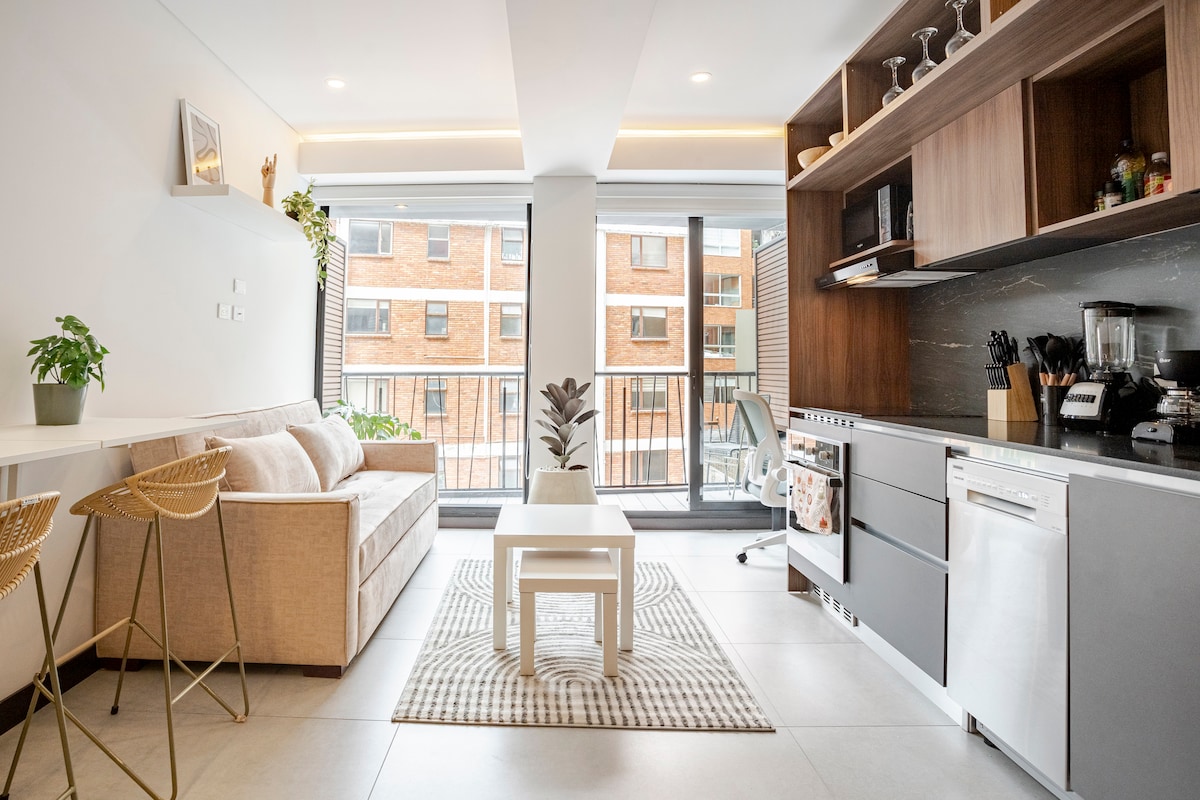 🌆 This accommodation is located in Quinta Camacho, a bohemian and vibrant neighborhood. 🌇 Enjoy the view from the 15th floor balcony and explore nearby restaurants and bars. 🛋️ Quiet and comfortable space to relax. Ideal for couples and solo travelers. 🏙️ 15th floor with spectacular views 🛏️ High-quality hotel-grade mattress 📺 65” TV with Netflix, Prime Video, and Disney+ 🏊 Swimming pool (reservation required), cardio area, game room 🚶 Steps away from Zona T and the financial dist
