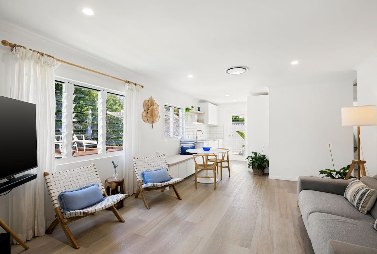 Take it easy at this unique, tranquil, modern and totally private getaway. The suite is situated on the ground floor of a three story ocean front property with only a few metres to the unpatrolled Shelly Beach. Ideal for a romantic getaway for a couple or a family with children. There are no stairs, own entrance, pet friendly (only friendly and trained animals are welcome)