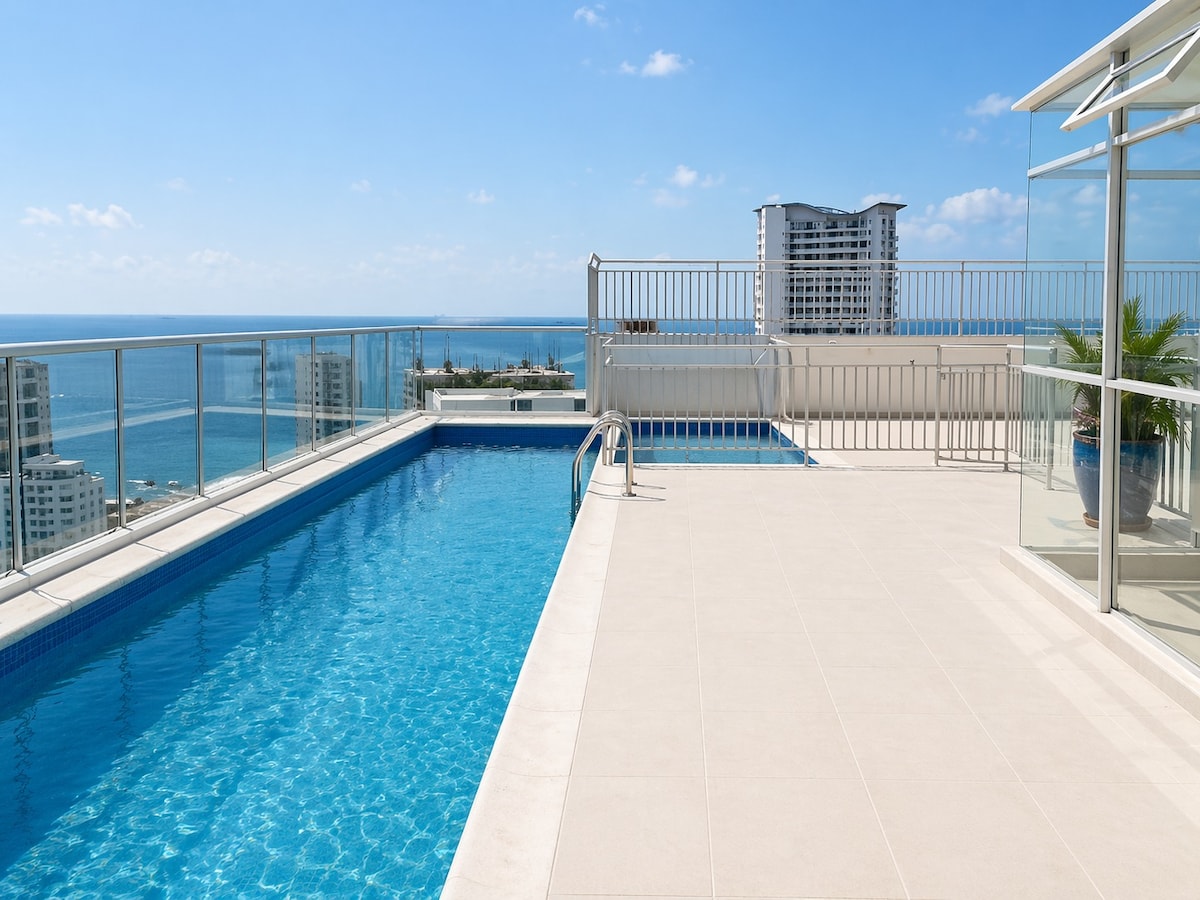 カルタヘナのボカグランデにあるモロスシティコンドミニアムのPH最上階から、豪華で快適、息をのむようなオーシャンビューを体験してください。家族連れ、団体、法人でのご宿泊に最適なこのPHコンドミニアムからは、海とコロンビアの「城壁都市」の両方を一望できます。約300度の景色とともに、日の出と夕日の両方を眺めることができます。