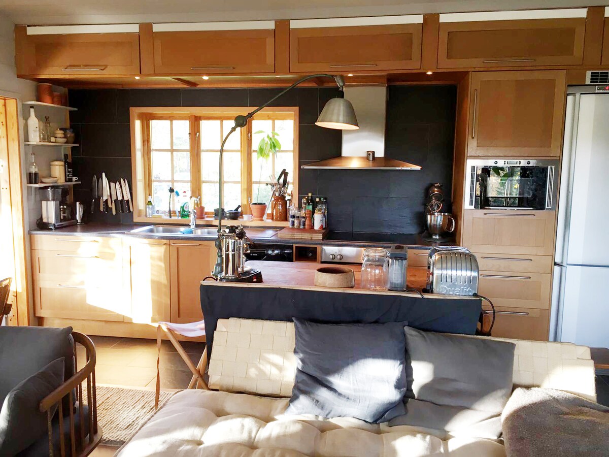 Welcome to this unique and quiet house on the cozy and car-free island of Tranholmen, just outside Stockholm's inner city. A nice architect designed house where you can have breakfast at sunrise and end the evening on your private big dock right by the water at sunset. Many different places at the location to enjoy that inspire you to swim, relax and cook and eat outdoors. Wood-fired sauna for up to 8 people. An outdoor shower just outside the sauna and the guestroom. There are 4 bedrooms