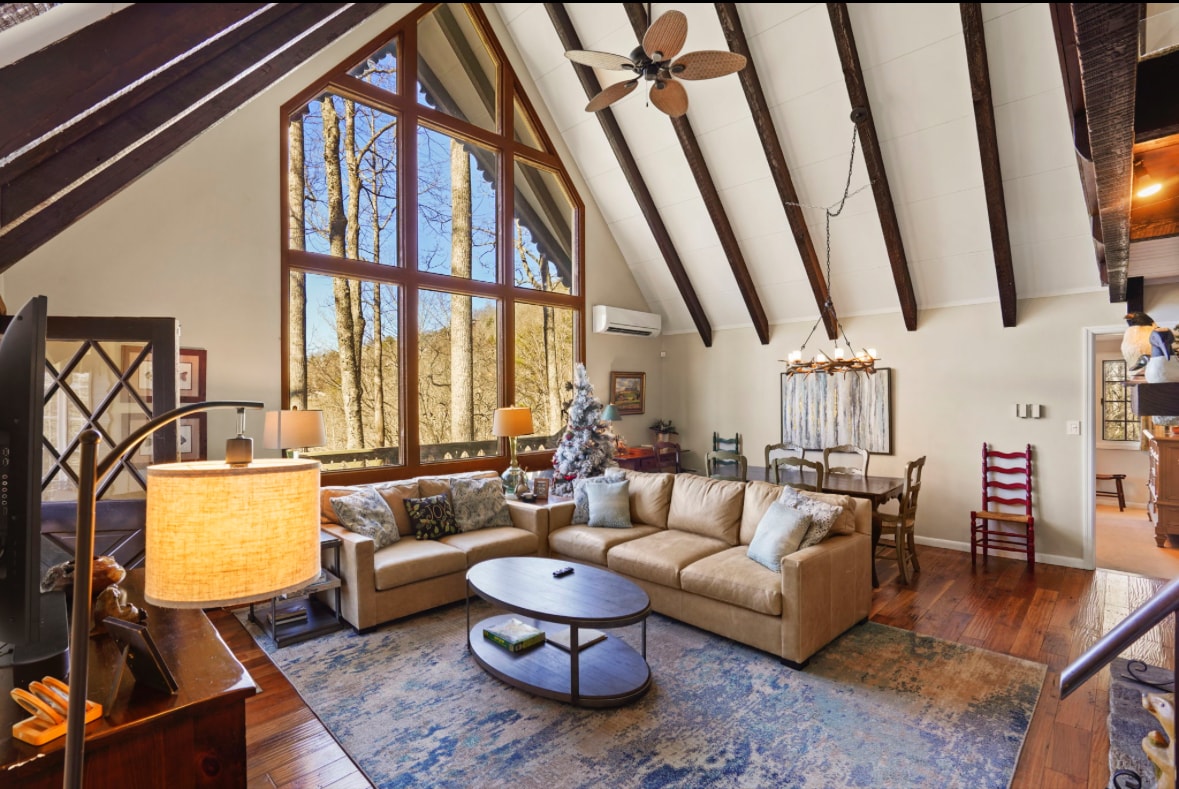 バナー・エルクの山のシャレー|ビーチマウンテンとシュガーマウンテンの近く ミルリッジの頂上にある広々としたロフトを備えた快適な2ベッドルームのシャレーで、バナーエルクのダウンタウン、グランドファーザーマウンテン、ビーチマウンテンスキーリゾート、ブーン、ブロウイングロックから数分です。山の景色、ハイキングトレイル、ワタウガ川へのアクセス、テニスコート、温水プールをお楽しみください。スキー、ハイキング、ダイニングへのアクセスが簡単で、静かな山でのんびり過ごしたい家族やカップルに最適です。バナーエルクでのんびり過ごすためにご予約ください。