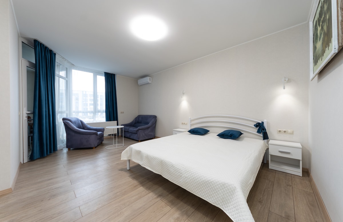 Ласкаво просимо! Студія знаходиться на 9 поверсі, метро Бориспільська - в кількох хвилинах ходьби. Студія обладнана для вашого комфорту: Wi-Fi, TV, кондиціонер, кухня з сучасною технікою, ліжко з ортопедичним матрацом, робоче місце, пральна машина, фен, праска тощо. Ідеально підходить для пар, індивідуальних мандрівників і тих, хто подорожує по роботі. До послуг гостей є автостоянка. У студії суворо заборонено палити.