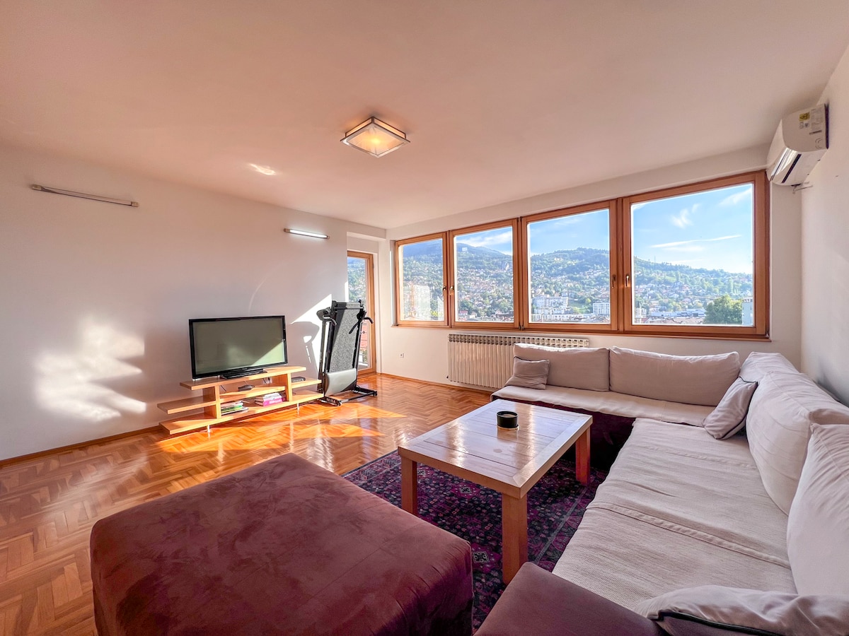 This unique and spacious, 90 square meters penthouse apartment, is centrally located at one od the most demanded neighbourhoods, safe, peacful and a 10 minute/800m walk to the heart of Sarajevo. It features 2 bedrooms, large bathroom, toilette, a modern large kitchen with all necessary amenities to make your stay convenient and pleasant. Newly refurbished, chic and has a lovely view of the city. During your stay, you can enjoy free WiFi, TV, AC, coffee machine and free parking on premises