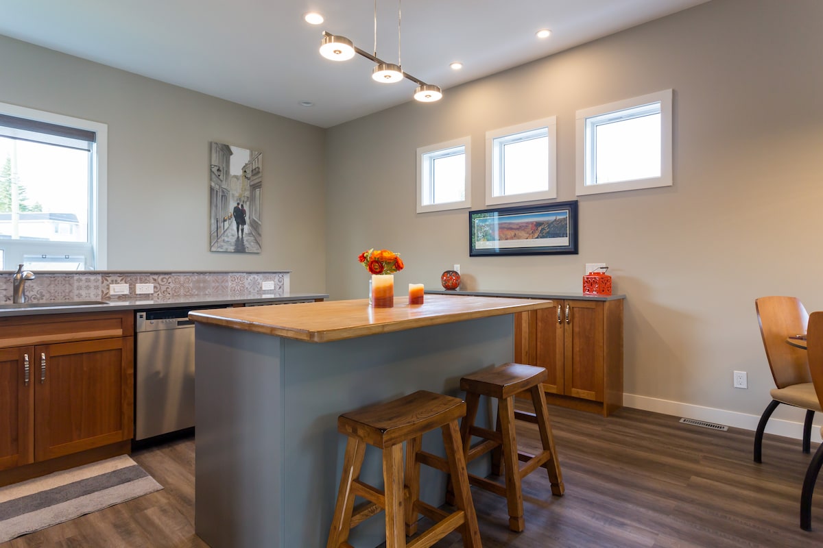 こちらの静かでおしゃれなお部屋で、冬を楽しみ、のんびりとおくつろぎください。 カナダオリンピック公園(ウィンスポーツ)と夕暮れの景色を楽しめる完全に独立した家のプライバシーをお楽しみください。 セントラルエアコン、クォーツカウンター、ハードウッドフロア、エアジェニシングジャグジーなどの豪華な設備があります。 ボウ川まで徒歩ですぐで、トランスカナダハイウェイ(1号線)にもすぐにアクセスできるので、山での冒険にも便利です! 専用の暖房付きガレージ1台分と、短期滞在または長期滞在のための路外駐車場が含まれています。