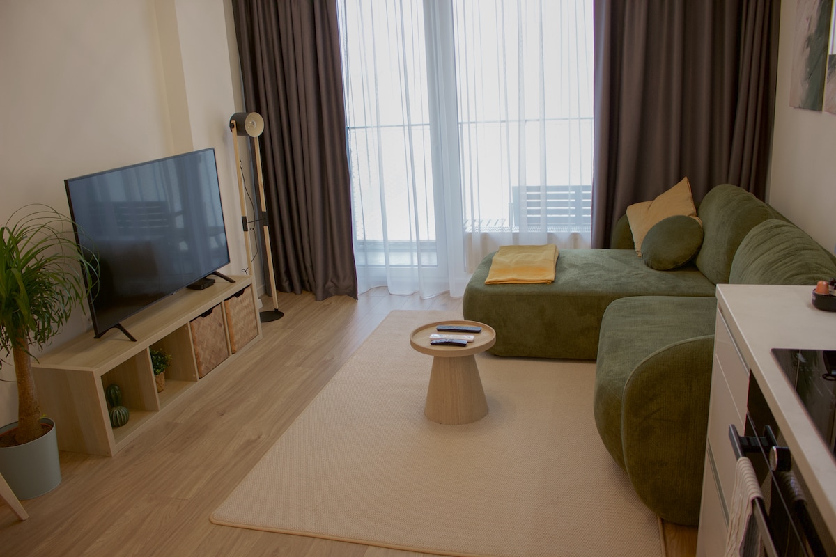 Enjoy a stylish experience from this centrally located apartmant. 1 bedroom apartment with an excellent location near the city center. Fully equipped. Close to the public transport (10 min to the city center), Retro shopping center, restaurants, ice cream, running track, fitness center etc. The apartment has a separate bedroom with balcony, a living room, work place, a smart TV, a kitchen (a washing machine, a fridge with a freezer, a hob, an electric oven, a coffee maker, and others).