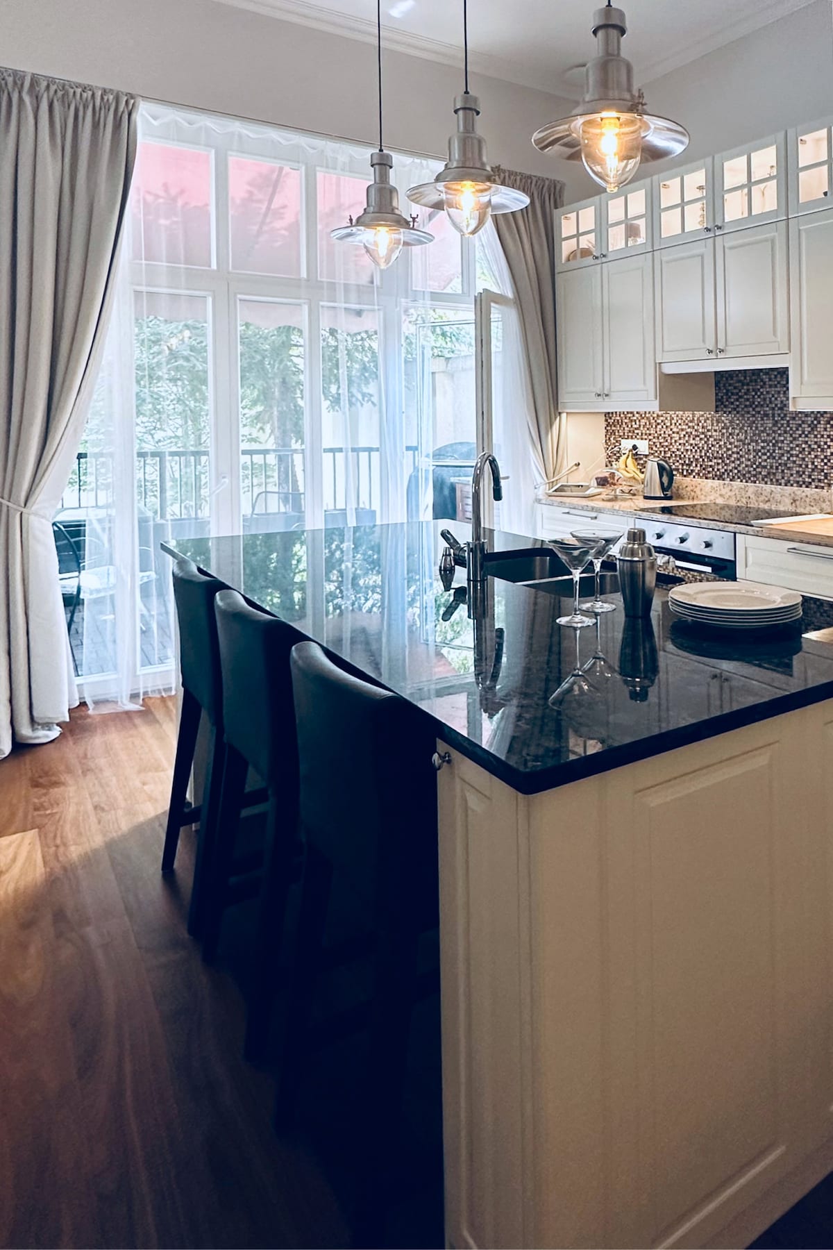 青い教会が見えるスタイリッシュなアパート