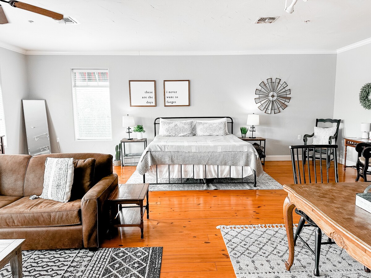 ウィンバリースクエアからわずか数歩のビアランチプロジェクトインは、テキサスヒルカントリーでの滞在に最適な宿泊先です。 Beer Ranch Project Studio #1には、豪華なメモリーフォームのキングサイズベッド、広々としたバスルーム、高速Wi-Fi、テレビ、電子レンジ付きの朝食用カウンター、ミニ冷蔵庫、コーヒー、紅茶など、必要なものがすべて揃っています。 お部屋でコーヒーを飲みながらリラックスしたり、パティオで冷たいビールを飲みながらくつろいだりできます。