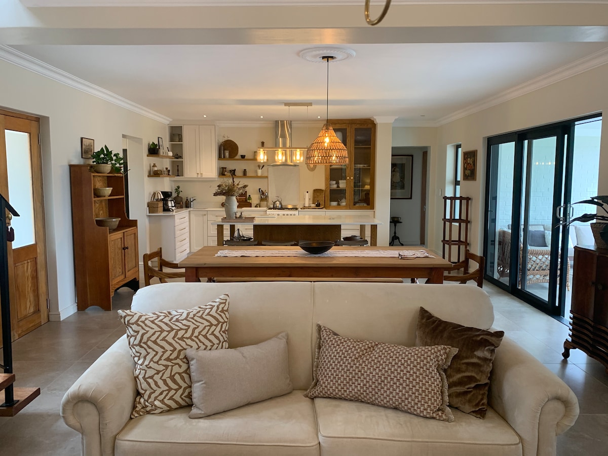 A big lavish holiday home with a partial seaview that is perfect for rest and relaxation. A group of friends or family will love the communal areas where one can dine, relax and create lasting memories. A highlight is the huge dining table in the open plan living area where guests can enjoy a family meal, play board games or just enjoy company. Pets are welcome. 🐾 Situated within walking distance from the beach and a restaurant in a quiet area with all the amenities you will need to unwind.