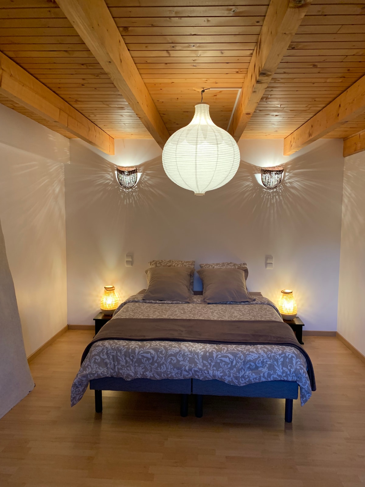 Chambre avec lit 140x200cm dans duplex. Salle de bain toilette au rdc partagée avec l'hôte. Cuisine non accessible. Petit-déjeuner sur demande (supplément de 5 euros). Petite terrasse extérieure. Deux chats vivent sur place