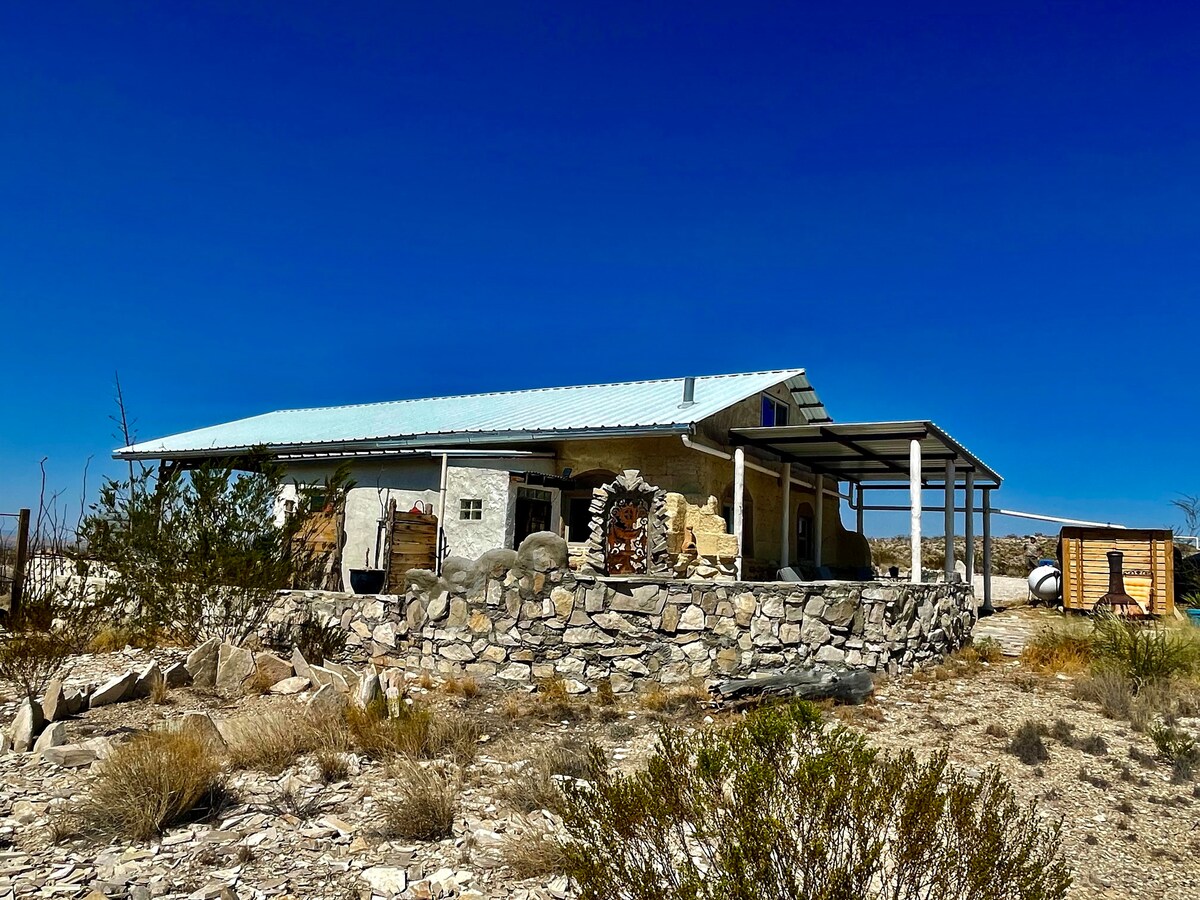 この宿泊施設はすべての人に適しているわけではないので、すべてお読みください。 このオフグリッドの家は、20エーカーの静かな土地にあります。 ポーチから素晴らしい景色と息をのむような暗い空を楽しめます! 自然と野生動物に優しいこの家は、ゲストに自然とのつながりを妨げるものなく提供します。 この家には、フルキッチン、シャワー、シンク、フラッシュトイレ、暖房、ソーラーシステム、お湯があります。 この家にはクイーンベッドと折りたたみソファがあります。 この家は、ビッグベンド国立公園とテリングアゴーストタウンまで車で35分です。