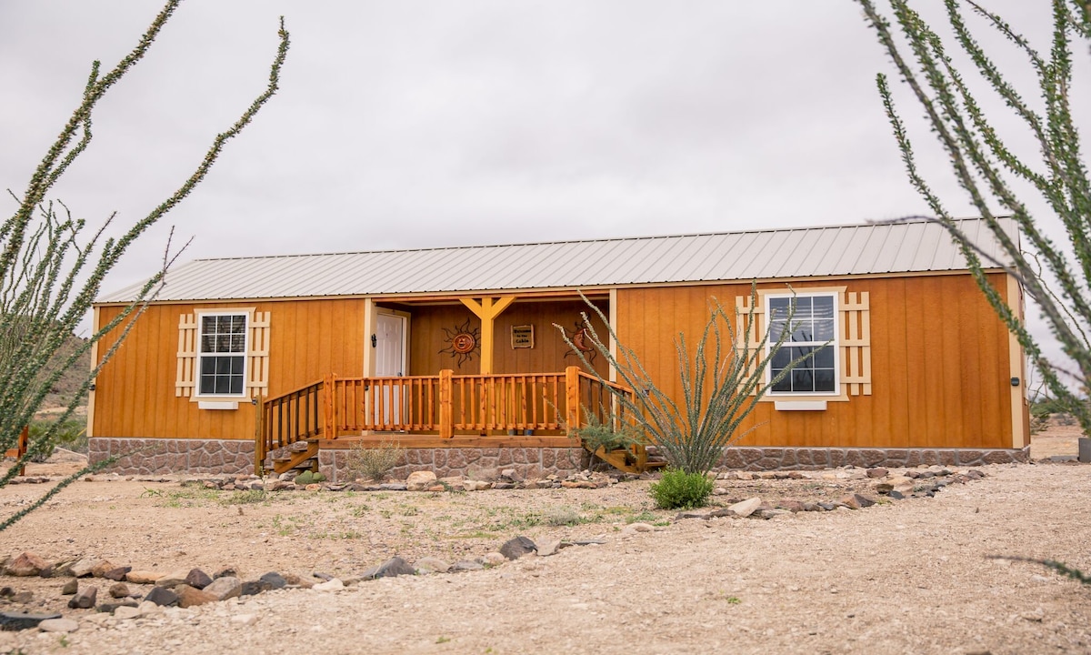 *10 MINUTES TO BIG BEND NATIONAL PARK *Private, but near everything! *Locally owned/operated! *324 sq ft charming Eco-friendly cabin for 2 adults (no kids) *COLD A/C, heat *Indoor&outdoor showers *Gas log fireplace *Super comfy Queen bed *Kitchenette *Full bath & clean compost toilet *Stunning views of Big Bend National park *Sustainable, SOLAR powered *Sunrise mountain views from your pillow *Incredible stargazing! *Come enjoy this unique desert gem, make memories of a lifetime!