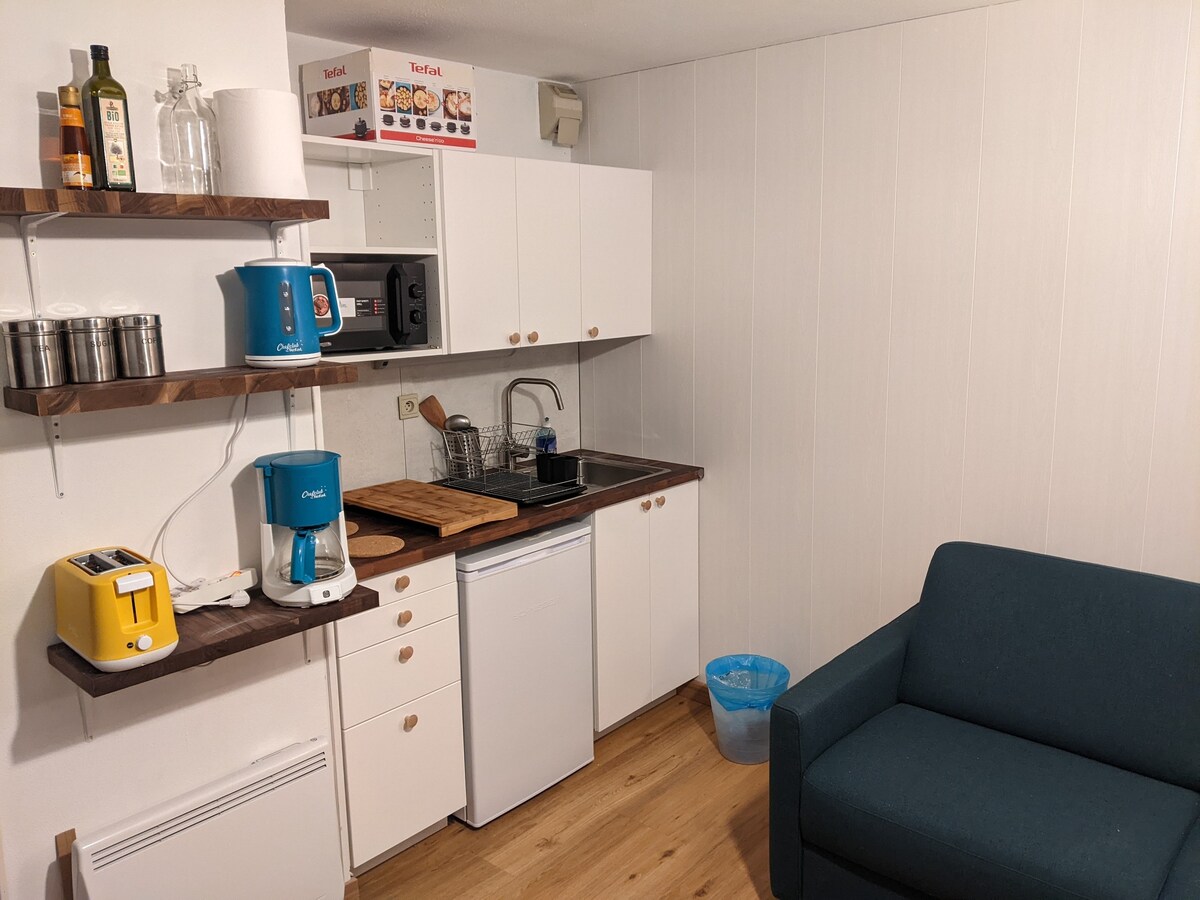 私たちの家の2階にある28平方メートルの改装されたアパート。螺旋階段でアクセスできます。18㎡のテラスは南向きで、山々の景色が一望できます。静かなエリアです。 1部屋には、設備の整ったキッチン、テレビ、無線LAN、ソファベッドが備わっています。 ダブルベッド(140x190cm)と二段ベッド(90x190cm)を備えた1つの寝室。 シャワーとトイレ付きの浴室が1つ。 2名様に最適な宿泊施設で、最大4名様まで宿泊可能です。専用駐車場。 市内中心部と駅から900メートル。