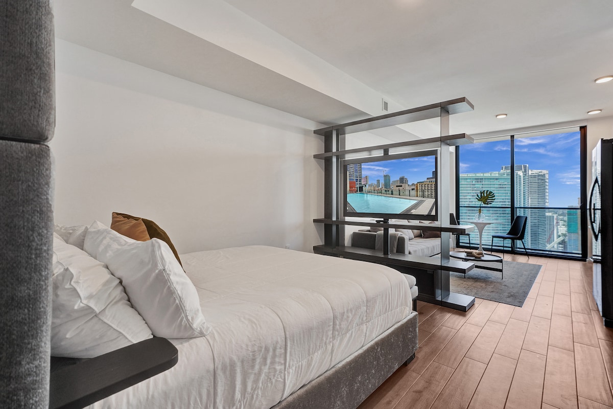 Wi-Fiとケーブルテレビが含まれた真新しいワンルームで、湾とマイアミのダウンタウンの景色が楽しめます。短期宿泊用のコンドミニアムで、クイーンベッド1台(机に変換可)とクイーンサイズのソファベッド1台が備わっています。ゴージャスなアメニティ、プール、ジム、ラウンジ、ビジネスセンター。 徒歩圏内にはナイトライフ、ブリケル、ビーチ、マイアミ空港に近いです。 ユニットは446平方フィートです。