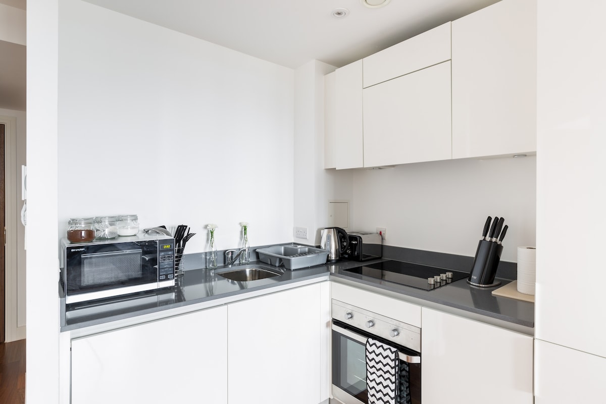クイーンズ・エリザベス・ビルディング(QE)と市内中心部に近いモダンな1ベッドのフラット