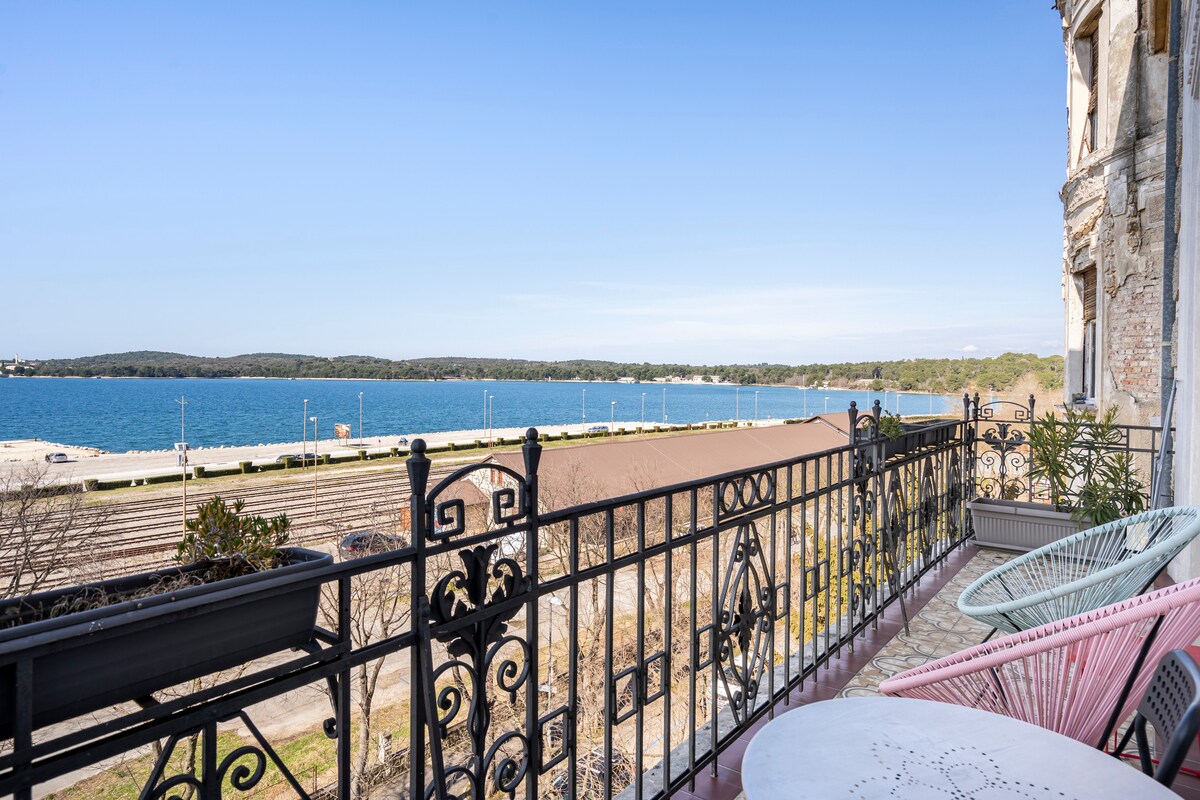Šarmantan stan površine 75 m² na trećem katu jedne od povijesnih vila Münz, smješten u samom srcu 3000 godina starog grada Pule. Stan se nalazi tik uz pulski amfiteatar, s parkom preko puta, svega korak od šetnice uz more te 5 minuta hoda do stare gradske jezgre. U blizini su željeznički i autobusni kolodvor, trajektna luka i brojne kulturne znamenitosti i turističke atrakcije. S balkona se pruža prekrasan pogled na luku, što čini ovaj stan savršenim izborom za sve koji traže mir i udobnost.