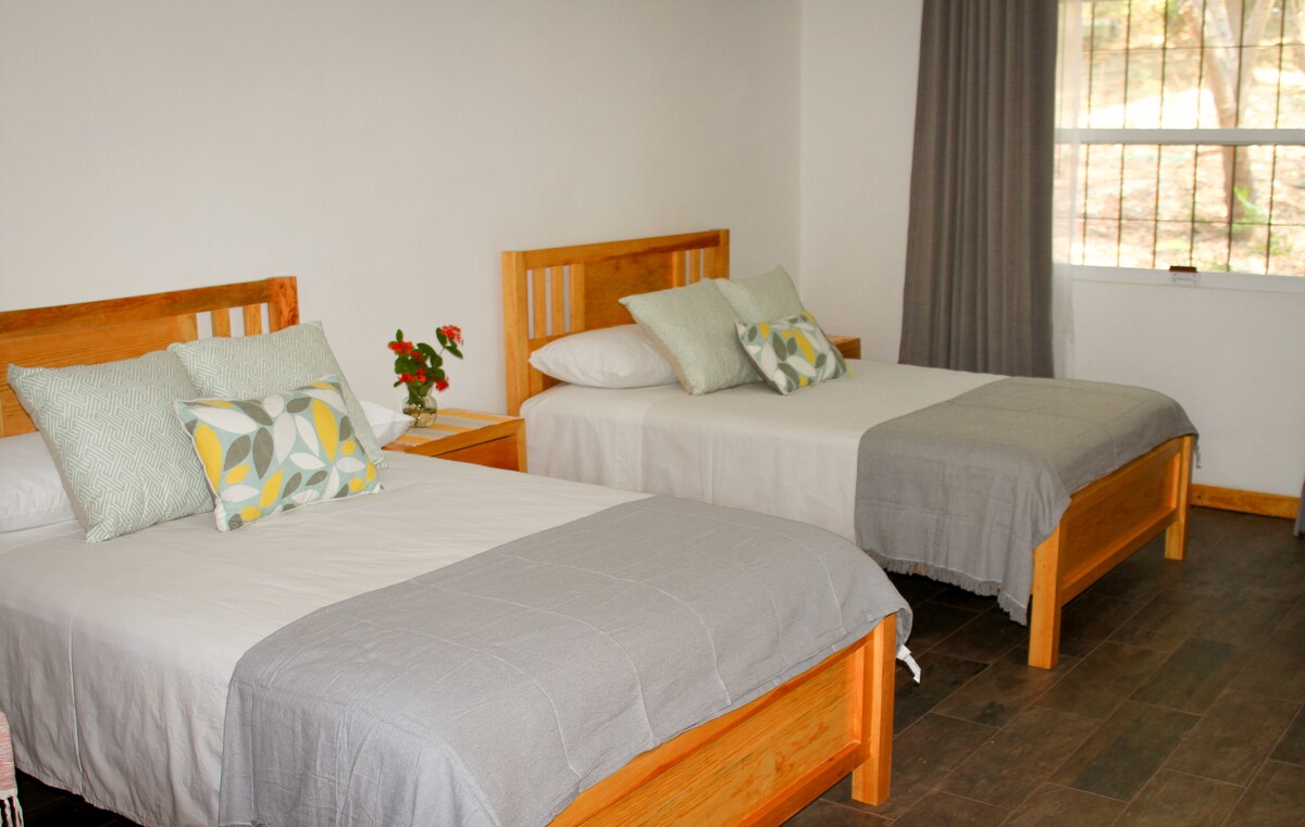 Relájate y disfruta de la tranquilidad en este espacio amplio, bungalow confortable con una cama matrimonial y dos individuales, con lo necesario para prepararte un desayuno ligero, hamacas, estacionamiento para 1 auto por alojamiento, a 1 cuadra de la playa punta Zicatela. Inicia tu día con un buen café, una caminata, desayuna y planea tu día, con clases de surfing, nadar, visitar playas cercanas, ir a un iguanario, ir de pesca, buceo, por la tarde disfrutar de un maravilloso atardecer.