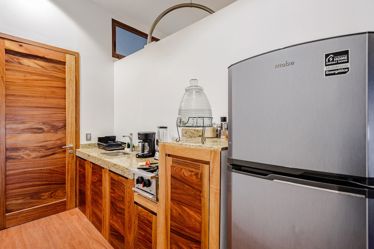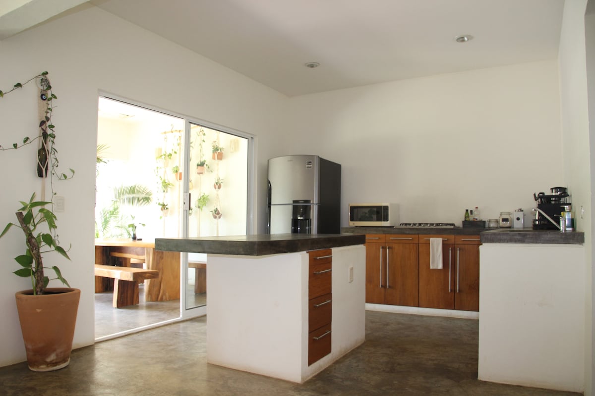 Depa amplio y luminoso en planta alta con 2 camas queen súper cómodas, A/C en la recámara y ventiladores en sala y cocina. Cuenta con cocina equipada, salita acogedora y balcón con vista a palmeras. Estás a solo 2 min de la playa y a 1 min de cafés, tiendas y restaurantes. Disfruta el patio compartido con hamacas, árboles frutales, asador y área de pesas artesanales. Ideal para relajarte, surfear o trabajar remoto con buena vibra.