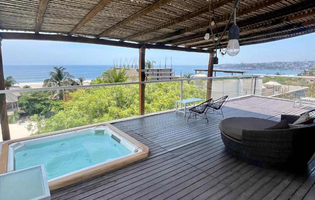 🌟 Nuovissimo boutique hotel sulla collina con vista su Playa Principal, Playa e Zicatela 🌊. A pochi passi da spiagge 🏖️, supermercato 🛒, negozi 🛍️ e vita notturna 🌃. A 10 min in auto da aeroporto ✈️ e La Punta 🌴. Vista mozzafiato e sala musica con pianoforte 🎹 a disposizione. Il proprietario, Emanuele Viscuso, artista internazionale 🎨, è sempre pronto ad aiutare. Oltre alla piscina panoramica 🏊, questa suite ha anche una jacuzzi privata 🛁.