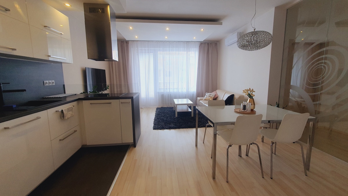 This new, sunny, spacious, quiet and fully equipped apartment offers you all the comfort you may need for your business or private stay to make you feel at home away from home. Great location, safe neighborhood, near city centre. • 58 sqm living space • 6 sqm balcony situated in the yard • spacious clothes room • garage parking with security in the night • Brno airport: 19 min by car • relax forest park: 5 mins walking