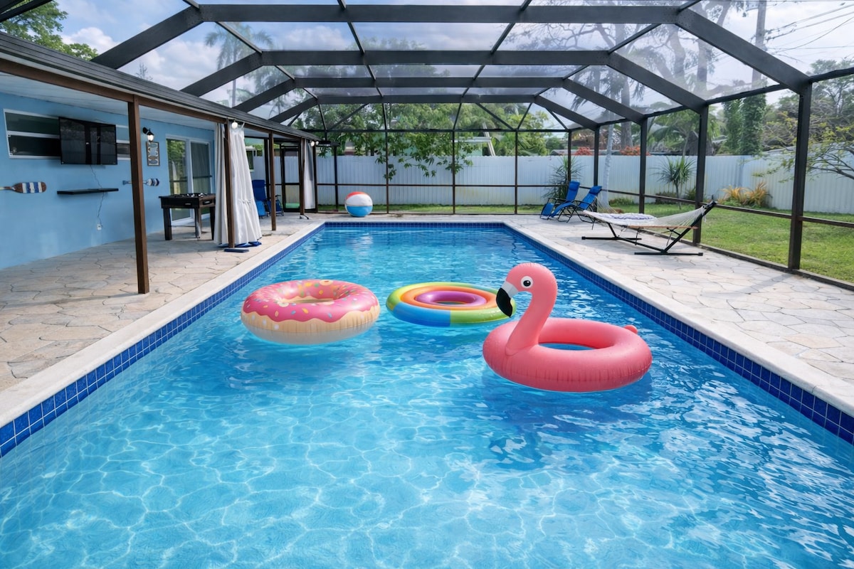 - GIANT HEATED pool with floats and amenities for everyone - HOT TUB perfect for a chilly night - ICE BARREL 400 to recover and cool off - POWER TOWER chin up and dip station - PUTTING GREEN - FIRE PIT to unwind - Hammock - N64 for 4 players - Coffee Bar - Record Player - EV/Tesla Charger, 48W - Propane Grill and Stocked Kitchen! - 7-Min drive to the beach! - Easily fits - 6 Adults and 4 Children Nows your chance to book the perfect escape for any group looking for the best in Ft Lauderdale!