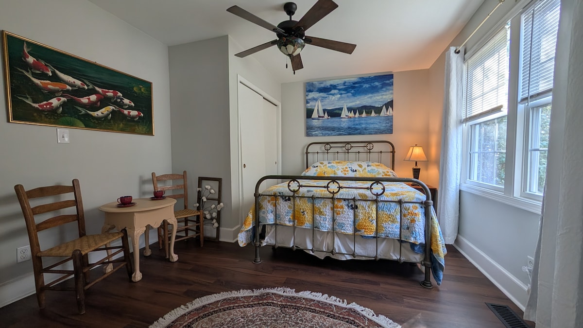 専用エントランスのある広いゲストスイートで、フルバスルーム付きです。独立したガレージの上にあります。500平方フィートのスイートは母屋とは別の建物にあり、とてもプライベートで静かです。 ウォーターフロントから数ブロックの場所にあり、サウスポートのショッピングやレストランまで徒歩圏内です。 クイーンサイズベッド、デスク、コーヒーメーカー/コーヒー、ミニ冷蔵庫。 お部屋には紫外線空気清浄機があり、安全で清潔に保たれています!ペットは禁止です。