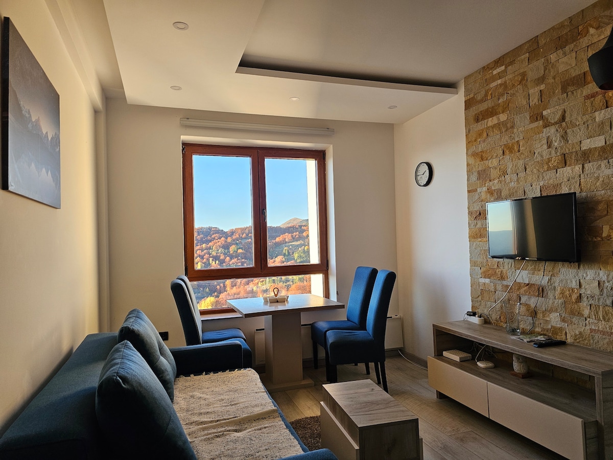 Our apartment have 40m2, two separate rooms, kitchen and bathroom. It is part of 4 stars apart spa hotel Zoned. It is equipped with new, modern furniture. Our guests have free parking, free wi-fi, tv. In the same building are indoor pool,spa,gym(charge), caffe and two restaurants that our guests can use. It is ideally located, in quite surronding, with a nice view, in the centre of village of Kopaonik, in 7 minutes drive from ski lifts (every 30 min there is organised mini bus from hotel).