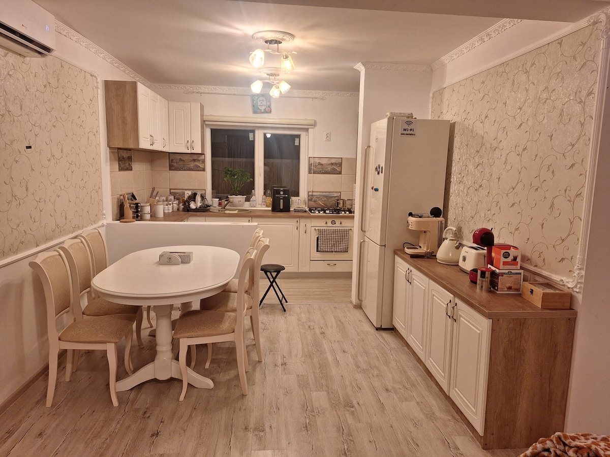 House near Therme Bucharest, Otopeni Airport, Edenland, Allianz-Țiriac Arena Ice Rink, Otopeni Olympic Swimming Complex, DN1 Value Center. Accomodation for 4 persons: 1 Matrimonial bed, 2 Single beds , 1 Sofa on living room, 2 bathrooms. Kitchen full equipated with all utilities. Free parking. Nice place to stay outside, to have a glass of wine or coffee or relax in a hammock and enjoy the silence. Also playground for children equipped with: trampoline, slide, 2 swings. Netflix included.