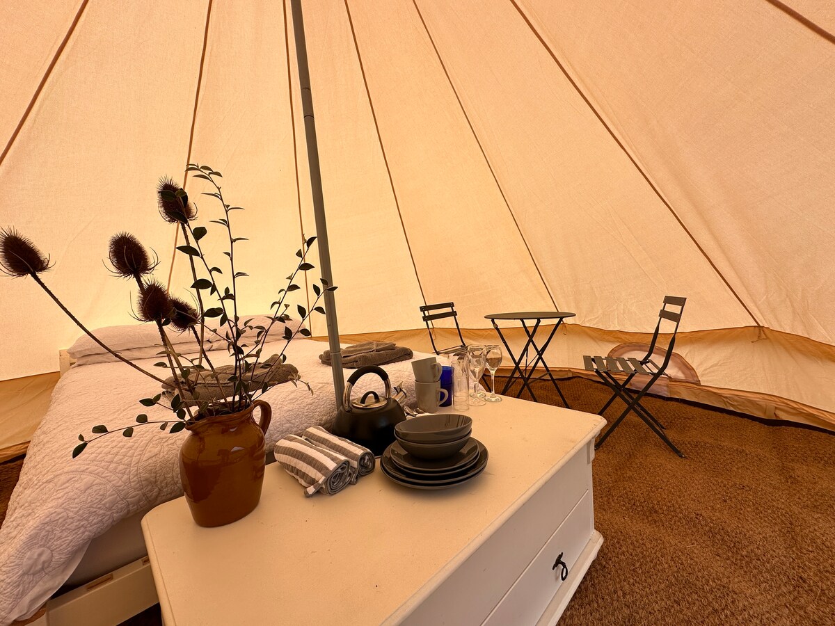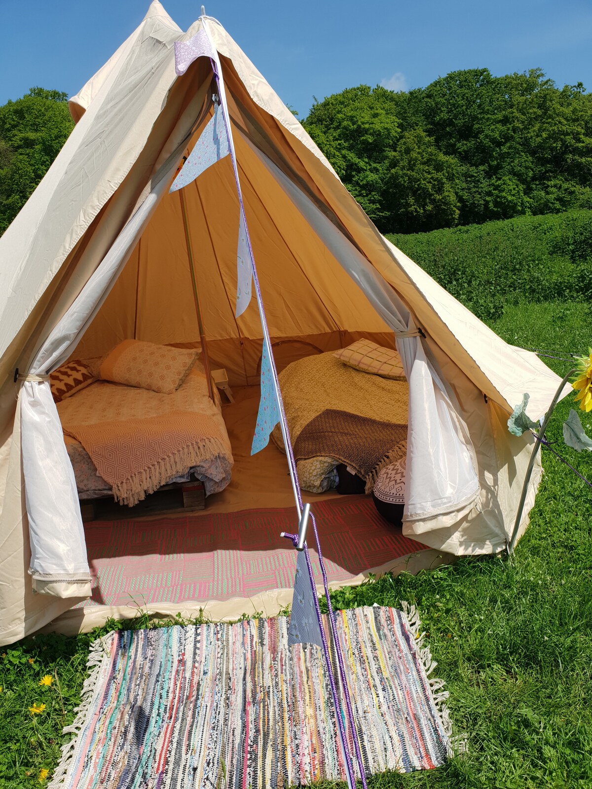 Beautiful Bell Tent, situated in a 4-acre meadow next to woodland with country views, Webber BBQ, firepit, and hammock. With an outdoor shared flushing toilet and hot shower. Hot Tub area is bookable only between 9am till 10 pm each day. Just a 8-minute walk to the Village Chackmore, 20 minutes to Stowe gardens, and 30 minutes to Buckingham. We recommend bringing: torch and extra blanket for night time. FIRE STOVES REMOVED IN MAY