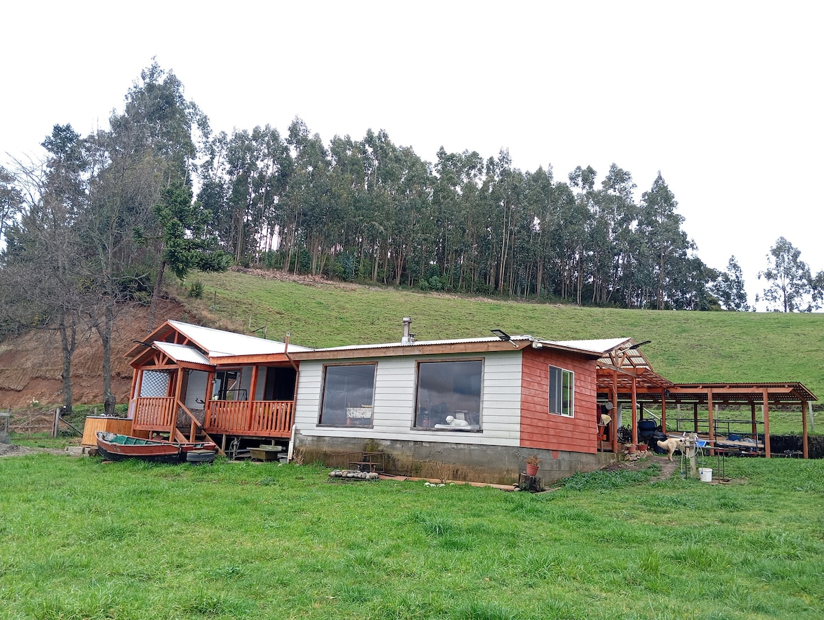 Comoda casa completamente equipada con una ubicación privilegiada rodeada de campo con puestas de sol maravillosas, cerca del río y de la ciudad. Se ubica en un sector muy tranquilo donde podrás escuchar el silencio y el canto de los pajaritos. Amplio espacio para compartir al aire libre, cuenta con wifi, tv, lavanderia, calefacción a leña y gimnasio entre otras cosas. Se ubica en plena ruta s-20 que conecta con Temuco en solo 20 min. A 17 kms de Nva imperial y 27 kms de Galvarino.