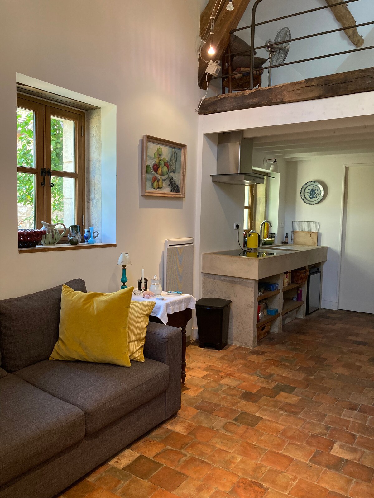 STUDIO de 30m2 dans une ancienne longère située en haut d'une colline vigneronne, au milieu d'un cadre arboré, mêlant charme de l'ancien, confort et design. Une grande pièce à vivre lumineuse, avec murs de terre et chaux, poutres apparentes, cheminée (non fonctionnelle), équipée d'une cuisine très bien équipée, d'un lit deux places 140x200 dont le matelas est tout neuf et d'un coin salon, ainsi que d'une salle de bain et WC privés entièrement créés pour le studio.
