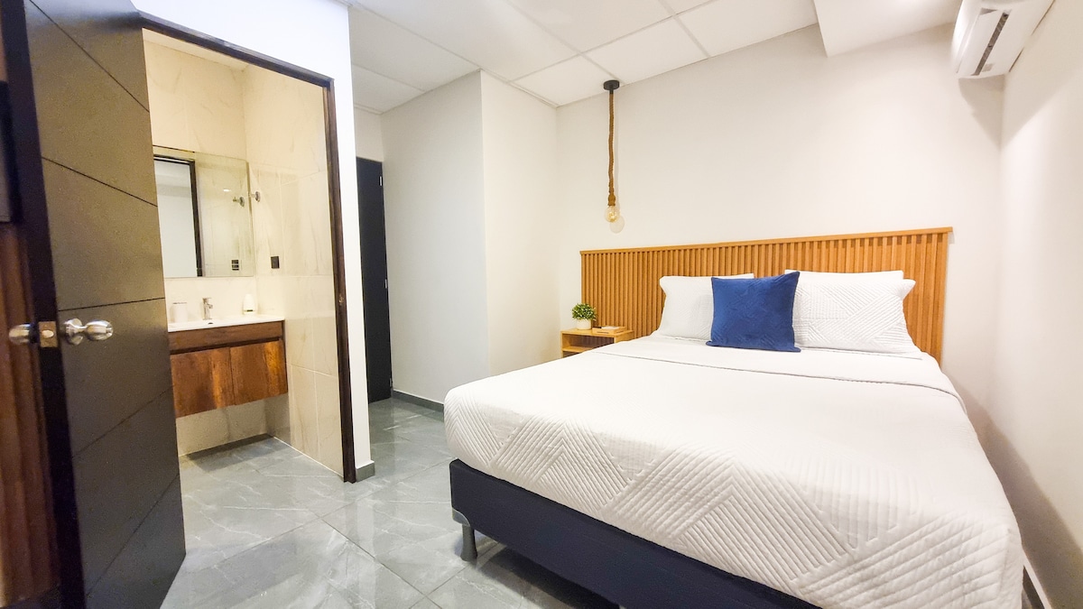 Modern apartment, access to mini gym and work cube, located in a safe residential area, 45 minutes from the airport, 15 minutes from the main shopping centers. In its surroundings there is easy access to supermarkets, pharmacies, Cuscatlán Stadium, bus services, restaurants, etc. Located on the fifth level, it has A/C, Smart-TV - 55 inches, Wifi 50 mg, kitchen, private bathroom, small desk space, laundry area. 1 private parking lot and remote controlled entrance.