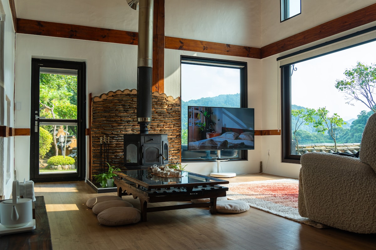 서울 근교의 평온한 전원주택 마을에 위치해 있는 300평대 독채입니다. 남향을 향해있어 아침햇살이 아주 따사롭게 비춰줍니다. 봄 벚꽃, 여름 계곡, 가을단풍, 겨울 설경, 사계절 최적의 숙소입니다 청결하고 미니멀한 숙소를 제공하고자 당분간은 게스트 최대 인원수를 3인으로 제한하고자 합니다. 2세 이하 영유아와 함께 방문시 최대 4인입니다. 게스트분은 독립적으로 2층집 주택의 1층전부와 정원을 전용으로 이용하 실 수 있습니다. 주인댁은 2층에 거주하시며 들어가는 입구가 분리되어 있어 프라이빗한 시간을 보내실 수 있습니다. 조용한 주택들이 모여있는 동네여서 평온한 휴식 시간을 즐기실 분들에게 잘 어울릴 만한 숙소입니다. [바베큐] 스탠딩 바베큐그릴 + 석쇠 준비 가능하며 추가비용은 1만5천원 입니다. [벽난로] * 벽난로는 기온이 영하로 내려가는 계절부터 피우기 시작합니다. * 벽난로는 화제위험과 실내로 연기가 퍼질수 있어 주인장이 직접피워드립니다~