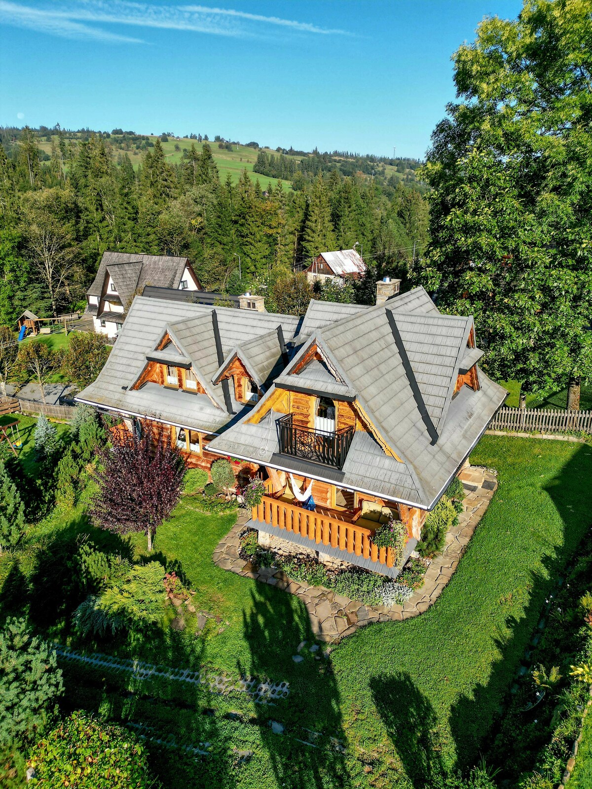Modrzewiowy dom położony widokowo na 4 strony świata. Widzimy z okna Tatry, Gorce , Babią Górę i Pieniny. Miejsce wyjątkowe spokojne . Droga odśnieżana prowadzi do rezerwatu Skałka wpisanego na listę UNESCO. Miejsce często odwiedzane przez turystów natomiast bez tłumu. Dom zaprojektowany w stylu alpejskim chalet. Wybudowany w 2018r. Lokalizacja 20 min do Białki Tatrzańskiej i 20 min do Zakopanego bez korków. Najbliższy wciąg około 10 min samochodem. Możliwość zamówienia domowego cateringu.