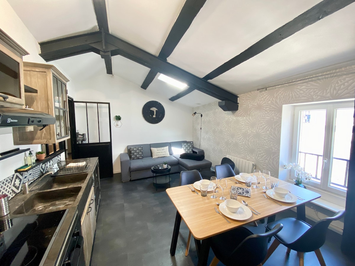 古い建物の3階と最上階にある25平方メートルの小さなコクーン。 アパートは完全に改装され、インテリアデコレーターによって趣味深く考え抜かれています。 石鹸、オリーブオイル、コーヒーポッドなどの必需品もご用意しております。ゆっくりとお楽しみください! 徒歩または自転車で! お車でお越しの場合は、ヴェルダン広場(有料)とシャンマン・デ・ランパール(無料)に駐車できます。 この地区はホールと調和して生きています。