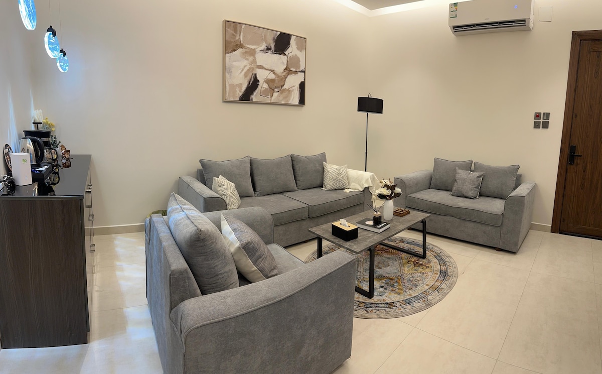 スマートエントランスを備えたプライバシーとセキュリティを備えた豪華なアパート。マスターベッドと寝室のニーズを備えた寝室が含まれています。 楽しい夜を過ごすためのスマートスクリーンを備えた5名様用の独立したラウンジ、無料インターネット、水、紅茶、コーヒーマシン、ケトル、冷蔵庫付きキッチン、シャワー用品付きトイレ こんにちは。
