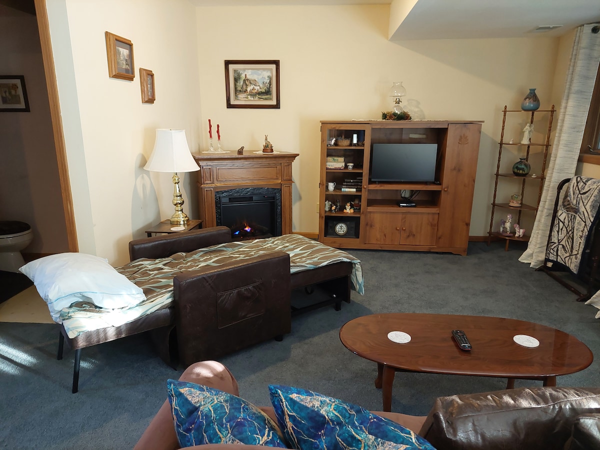 Vaulted skylights allow natural light. Ksize bed. Couch opens into a full size bed. (DEEP cleaned to AirBnb COVID-19 disinfectant standards) Fully stocked kitchen, sm. bathroom w/ shower. Parking ft. of house, 1.5 M from Lake Michigan Shoreline, 2 blocks to 15th St. entry to Prairie-Dune Trail. European Market (May -Oct) each Saturday downtown. Fall season drives along U.S. HW 12 & 20 for foliage Winter day hikes, x-county skis trail, shopping trips to the Michigan City Outlet mall.
