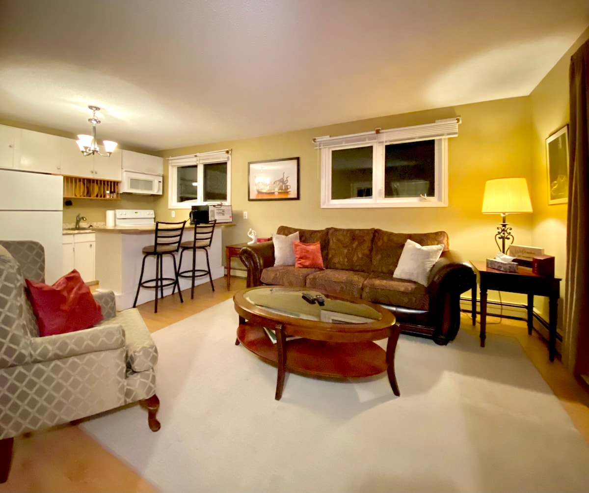 中心部に位置する私たちのプライベートユニットへようこそ。 充実したキッチンを明るくする大きな窓、55インチスマートテレビ、ボードゲーム、レコードプレーヤーを備えたエンターテイメントスペース、クイーンベッドとエアコンを備えた快適なベッドルーム、大きなバスルーム。 専用の駐車スペースの横にある専用の屋外エリアをお楽しみください。 キッチンには以下が含まれます: -トースター - キューリグコーヒーマシン+再利用可能なカップ - コンロ ・ケトル ー鍋、フライパン - 調理器具とその他のキッチン用品 - 電子レンジ 冷凍庫付きミニ冷蔵庫