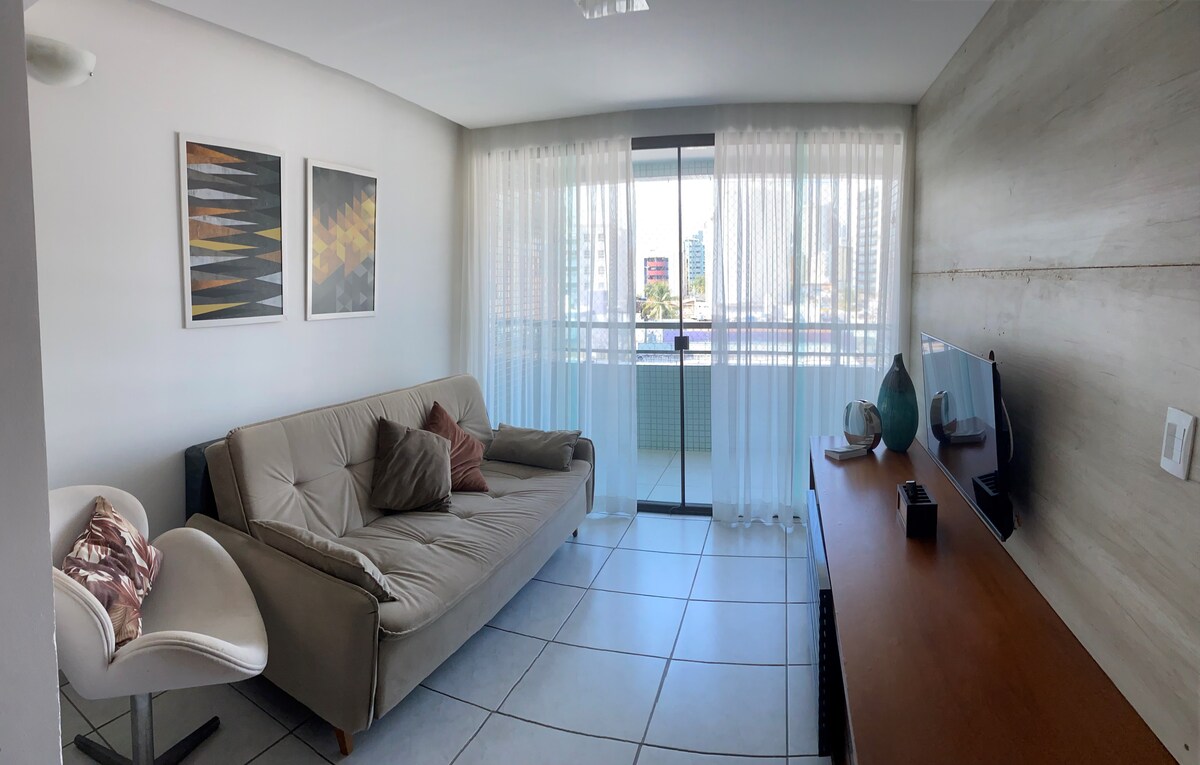 Sala com sofá e smart TV, cozinha americana com fogão, geladeira, micro-ondas, cafeteira, liquidificador, torradeira e utensílios, tudo novo. Quarto de casal com suite, segundo quarto também com cama de casal. Ambos os quartos com ar condicionado, armários e mesas para computador. O apto ainda dispõe de Wi-Fi, banheiro social e varanda com vista lateral para o mar,com uma deliciosa rede. Garagem coberta . Temos uma ampla área de lazer, piscinas, jacuzzi, academia, play ground. Pertinho da praia.