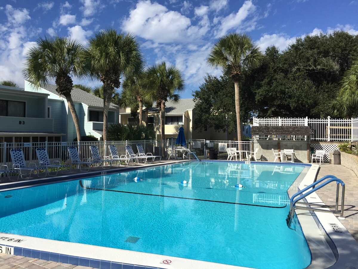 美しいセントオーガスティンビーチの海とプールの景色が見えるこの2/2.5タウンハウススタイルのコンドミニアムは、ビーチまで徒歩ですぐです。 活気あふれるこの街が提供するすべてをお楽しみください。2つの静かな寝室とバスルームが2階にあります。2つの専用バルコニーがあります。 下の階にはフルキッチン、6人用ダイニングエリア(または明るいワークスペース)、ハーフバスルーム、新しい65インチテレビを備えたリビングエリアがあり、歴史的なダウンタウンから10分です。 プール、テニス、ピックルボール、ボッチャボールコートを備えたファミリー向けリゾートコミュニティ。 ビーチチェアとタオルをご用意しました。