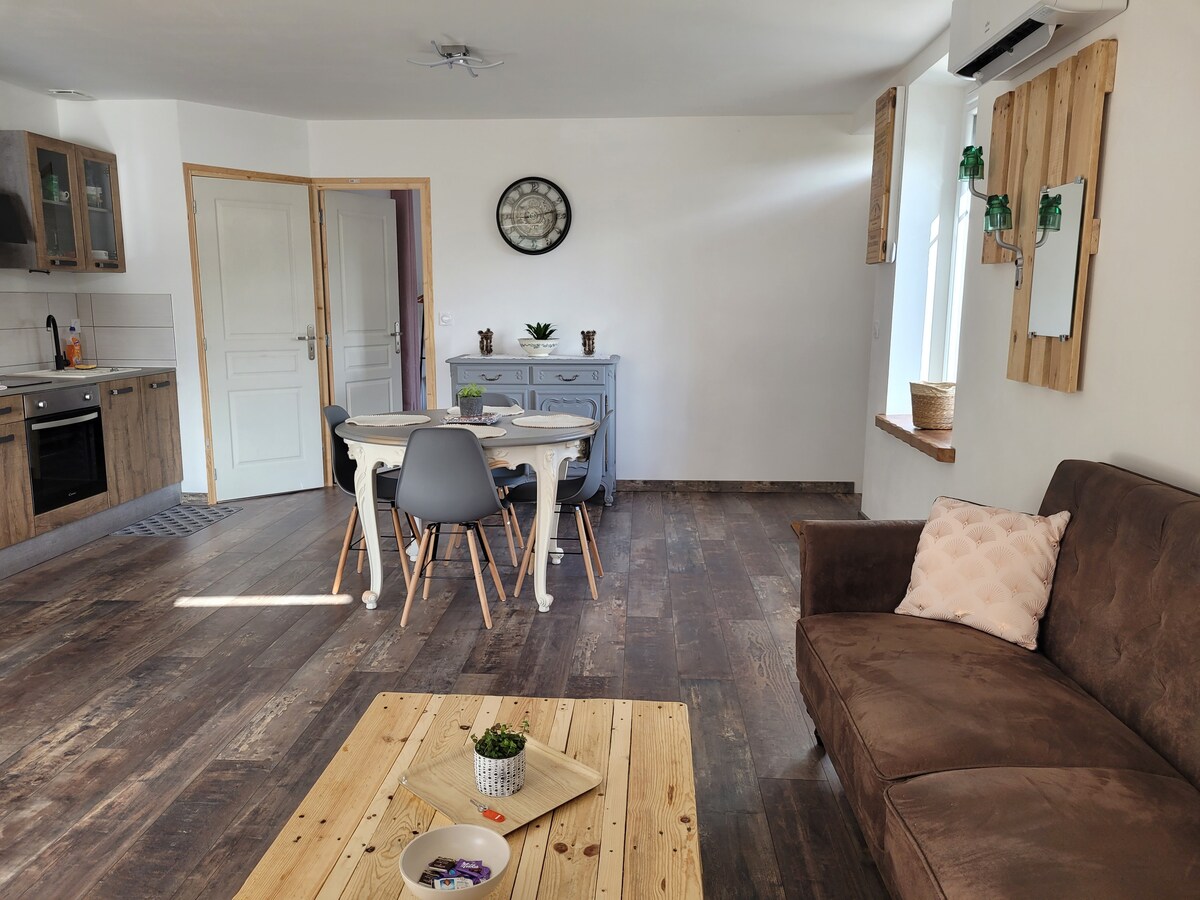 80平方メートルの田舎の家で、1階にダブルベッドがある2つの寝室(シーツとタオルが用意されています)でお迎えします。ソファー、ロッキングチェア、大画面テレビなどが備わったリビングでリラックスしてください。キッチンには2台目のテレビが備わっています。バスルームには、2つの洗面台を備えた大きなシャワーキャビンがあります。庭、ラウンジチェア、ペタンクコート、テラス、バーベキューでリラックス!仕事に取り組む方のためのWi-Fiアクセス。 専用の中庭、車は安全です。