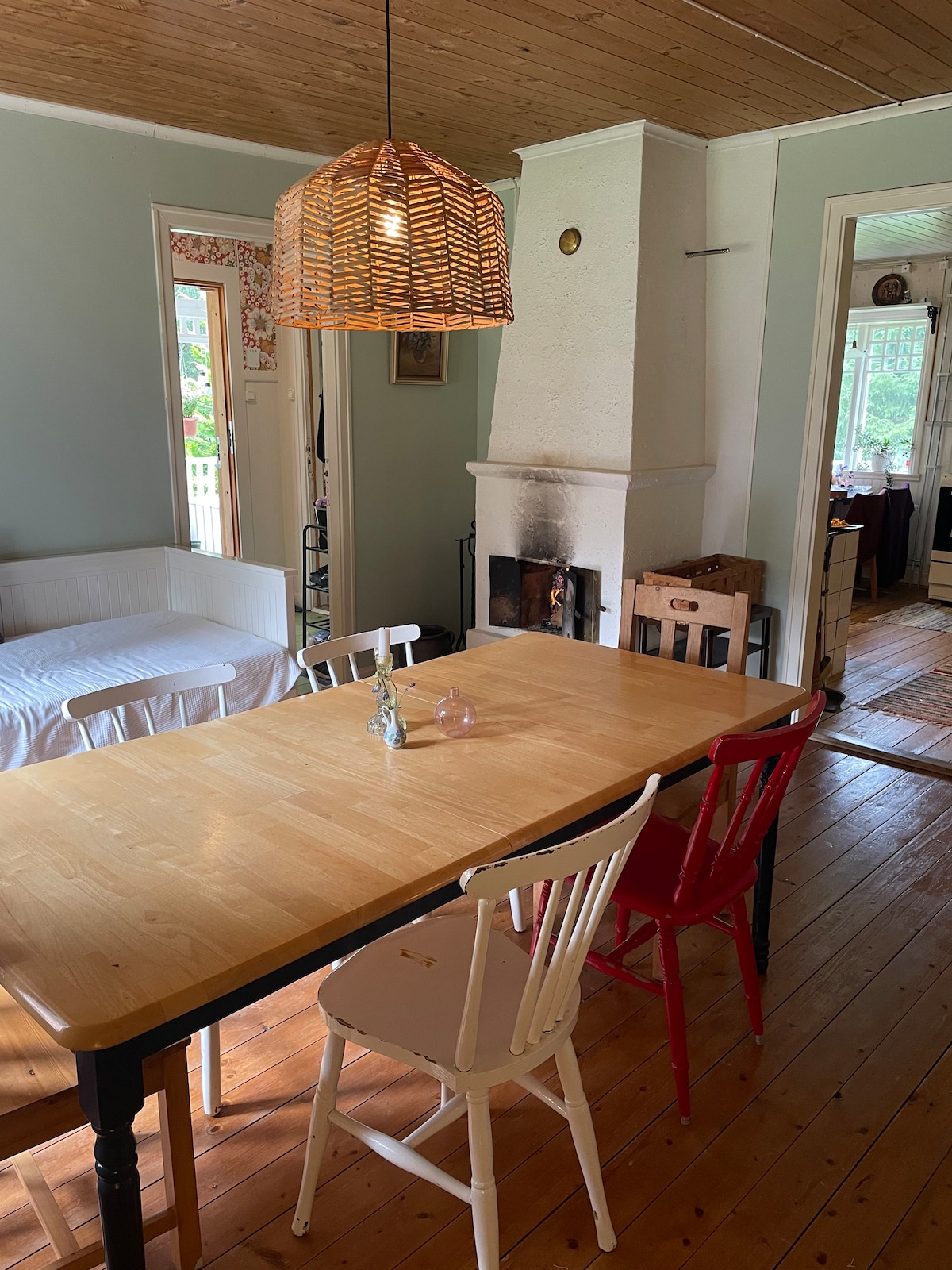 Old house originally from the 18th century, renovated with old details left. 100 sqm with well-equipped kitchen (also wood stove), toilet with shower and washing machine. Two bedrooms and two living rooms. 30 m to the lake, surrounded by mushroom & berry-rich forest. The lake is perfect for long-distance skating in winter. Charcoal grill. Summertime access to own boat. Wifi. TV. Private location along a private road. Furnished sunny terrace and a large garden.