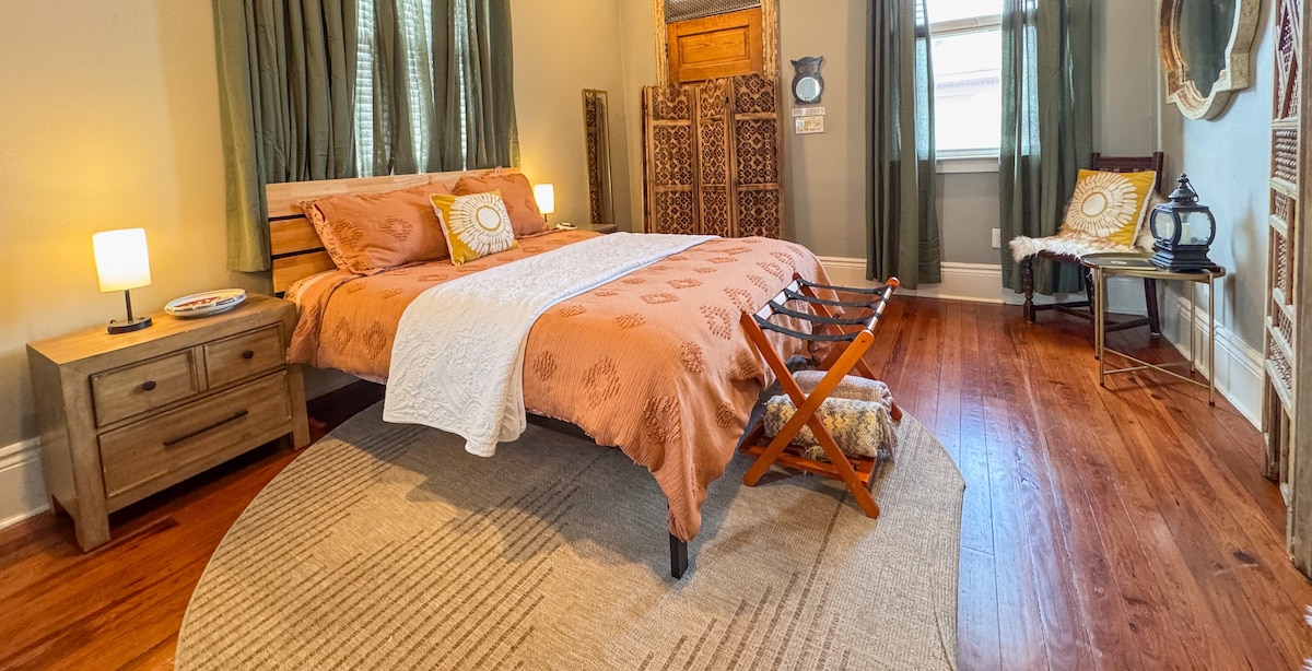 The Black & Goldへ⭑ようこそ⭑。このスタイリッシュな2ベッドルーム、2バスルームのスイートは、むき出しのレンガ、オリジナルの木製の梁、広々としたプライベート屋外エリアを備え、ニューオーリンズの魅力と高級感のある快適さを兼ね備えています。カップル、友人、少人数グループに最適なThe Armstrongには、設備の整ったキッチン、6人用の屋内ダイニング、明るいリビングエリアがあり、ウェアハウス地区の中心部に位置しています。フレンチ・クォーターからわずか数歩の場所にあり、街を散策するのに最適な拠点です。