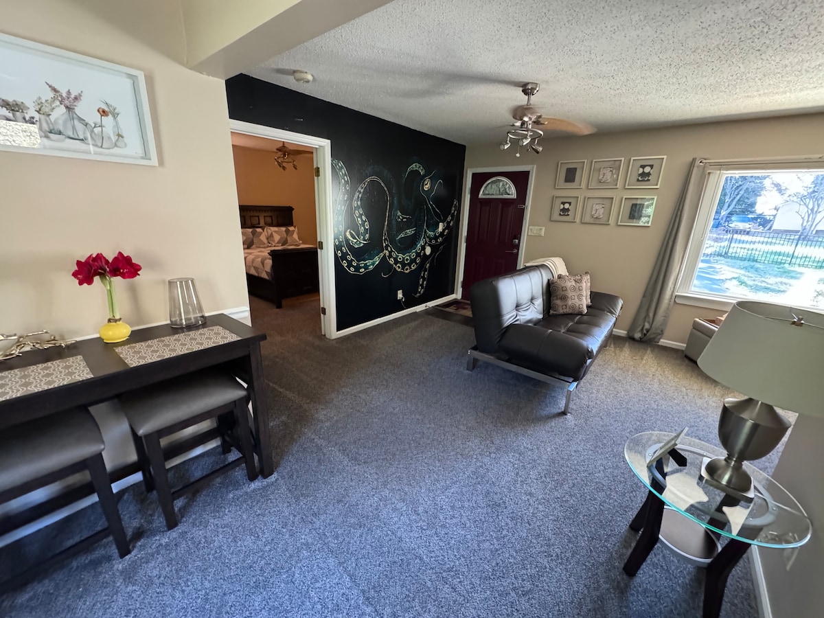完璧な隠れ家へようこそ! 私たちの魅力的なゲストハウスは、居心地の良さとモダンな設備を兼ね備えています。 この魅力的な空間には、広々としたリビングエリア、設備の整ったキッチン、そして豪華なクイーンサイズのベッドを備えた快適なベッドルームがあります。 無料のストリーミングチャンネルを含む大型50インチスマートテレビがあります。 また、お好みのストリーミングチャンネルにログインすることもできます。 地元のアトラクションやレストランの近くにあり、わが家のような居心地です。 あなたのご滞在を楽しみにしております!