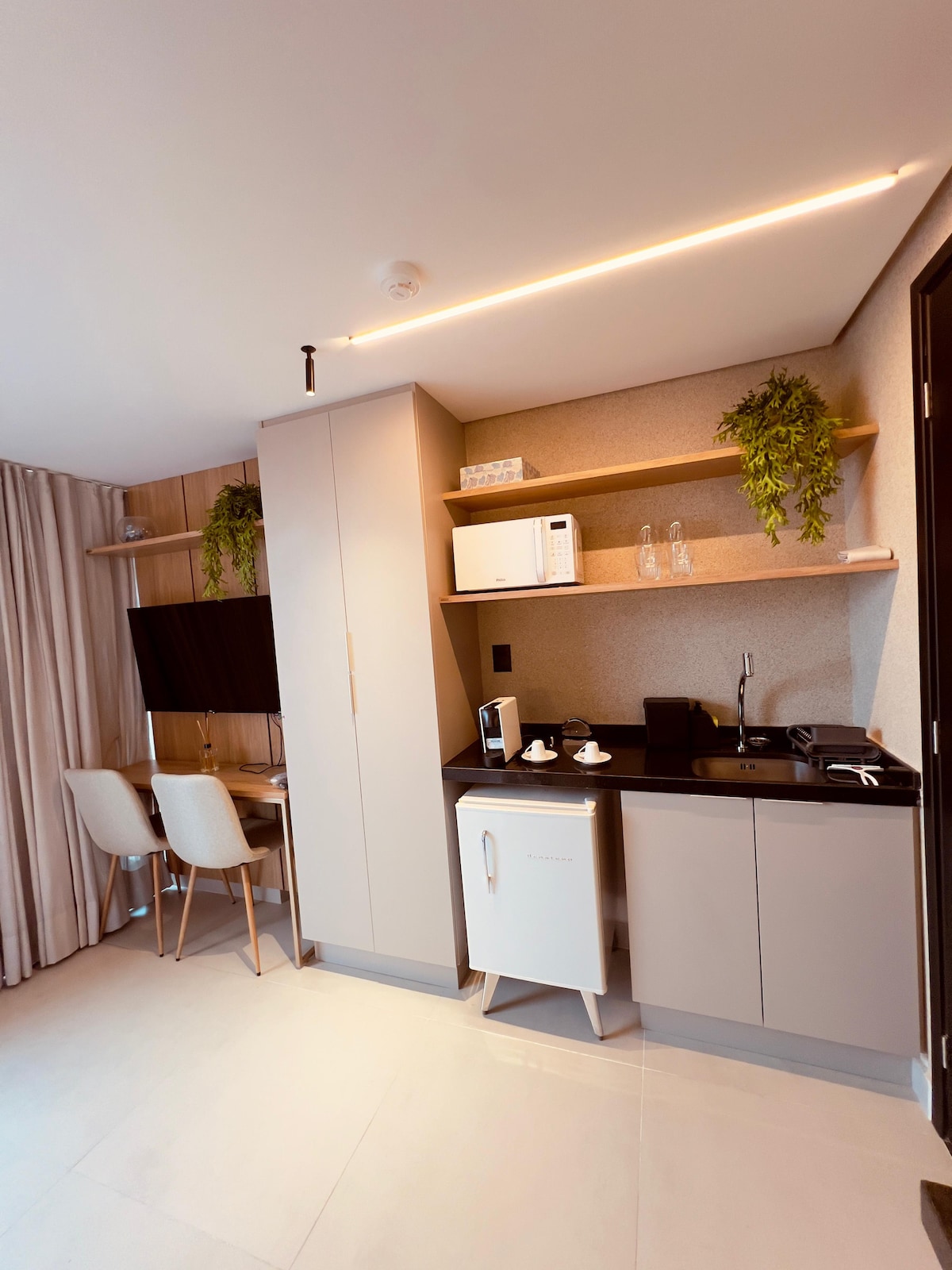 Wi-Fi grátis e estacionamento rotativo SmartTV LED 40" Alimentação e bebida: cozinha americana com frigobar cooktop, micro-ondas, cafeteira e saunduicheira Ar condicionado Split Banheiro: banheiro privativo com chuveiro, toalhas. Conforto: controle climático, cama Queen ultra confortável. Não oferecemos serviço de limpeza diária. Longas estadias, o serviço de limpeza pode ser negociada antes da reserva. Café da manhã não incluso na diária*