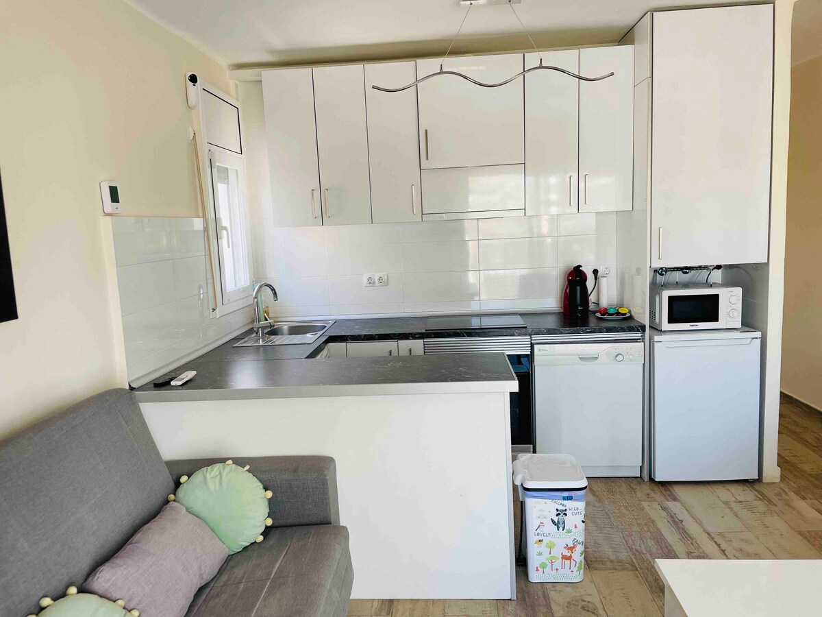 あなたの休暇の隠れ家へようこそ!2つの寝室、設備の整ったキッチン付きのリビングルーム、シャワー付きのモダンなバスルーム。エアコン/ヒートポンプの2つのスプリット。自宅のように感じるために必要なものがすべて揃っています。目を覚ましてバルコニーでコーヒーを楽しみ、山の景色を眺めることを想像してみてください。居心地の良い装飾。とても明るいです。山のハイキングルートと組み合わせた太陽、砂、海の日々を楽しむことができます。ポート・アドベンチャーワールドの近く。フェラーリ