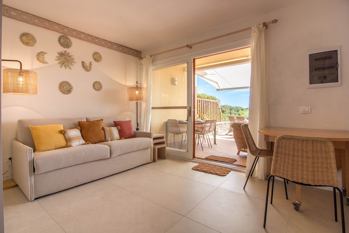 Goditi le tue vacanze in questo elegante appartamento con terrazza vista mare, appena ristrutturato e vicino alle splendide spiagge della Costa Smeralda. Dispone di un salone con divano letto (140x200), cucina attrezzata, camera matrimoniale (160x200), bagno moderno, zona lavanderia e veranda posteriore con vista sulla macchia mediterranea. A pochi passi troverai mini-market, tabacchi e ristoranti. Dotato di WiFi, Smart TV 40’’ e parcheggio gratuito.
