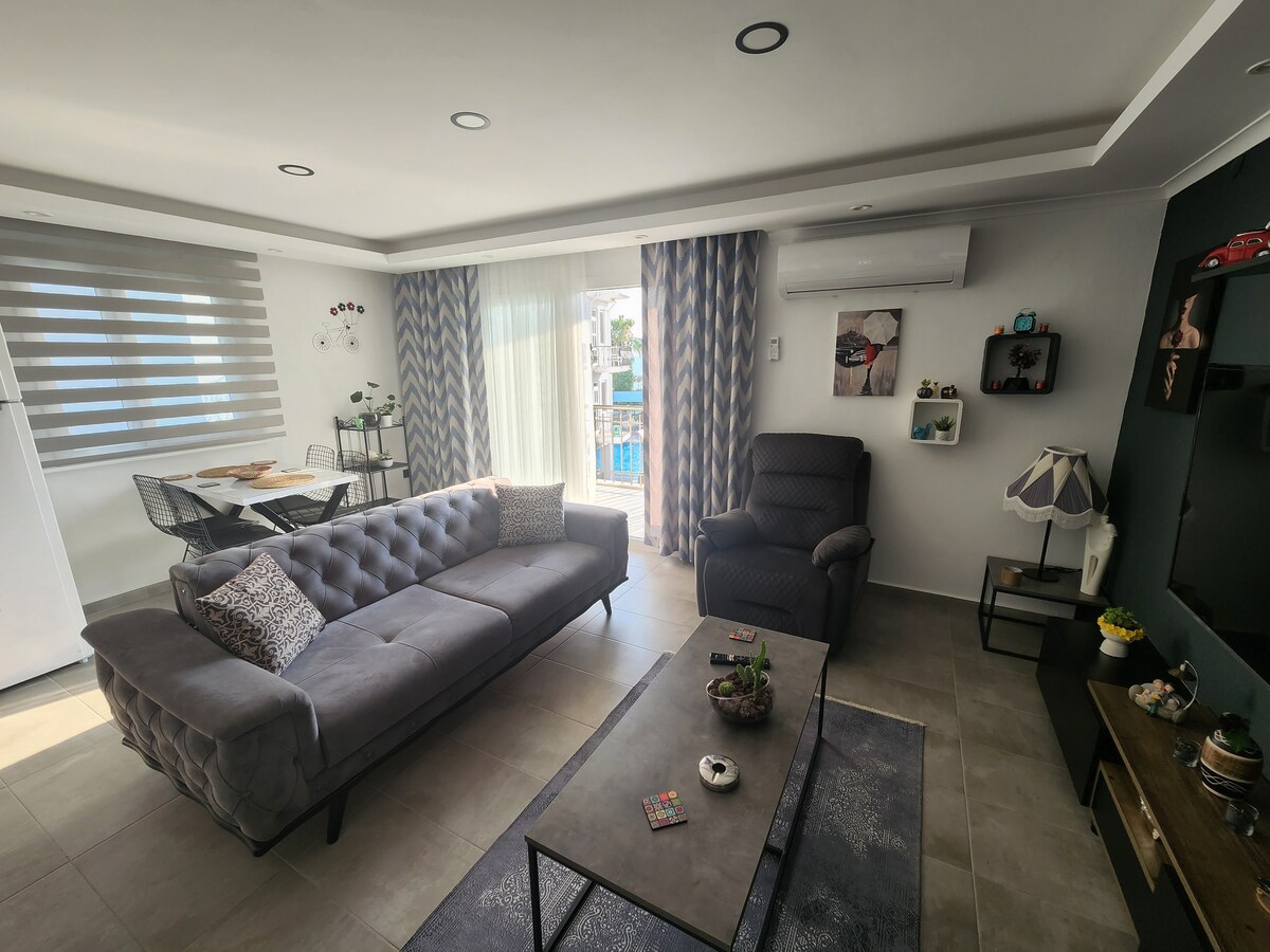 1-bedroom apartment for two in peaceful Fethiye🌿 Filter coffee machine, microwave, silverware set, fiber Wi-Fi, 50” Google TV, air conditioning, washing machine, hair dryer, iron, hangers. Outdoor sitting area and common pool in front (closed for swimming until end of April). Hot water by solar, electric backup on cloudy days. Just a 7-minute walk to shops, restaurants, the park, and the nearest bus stop. Pets welcome especially dogs! Crib or bed for infants under 2 not available