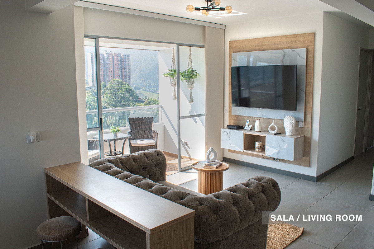 Moderno apartamento con hermosa vista a la montaña, ideal para disfrutar de una estadía tranquila y confortable en familia. Dispone de wifi, parqueadero privado, portería 24 horas, cocina totalmente equipada y TV en todas las habitaciones. La habitación principal cuenta con cama queen y las dos adicionales con camas semidobles. Ubicación estratégica cerca de supermercados, restaurantes y del parque de Sabaneta.